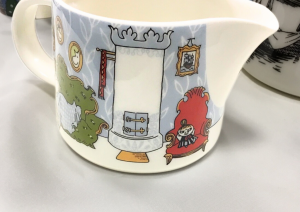 一方パステル調の明るい絵柄のこちらのピッチャーは各々が穏やかに過ごしている様子が描かれています。