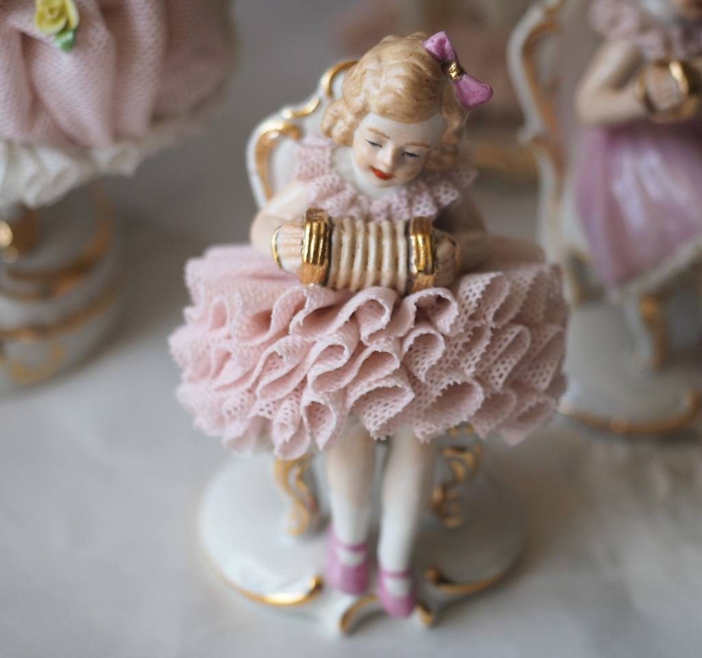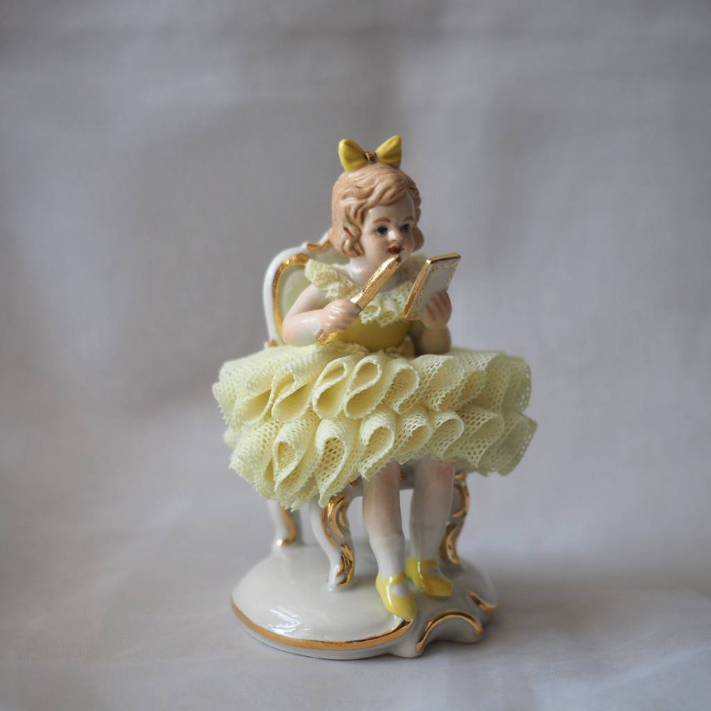 本物のレースを磁器粘土の溶液に浸し、素焼きのビスクドールに配置して焼成することで、レースの網目模様を再現しています。