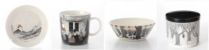モノトーンがベースになっているこのイラストは、原作者であるトーベ・ヤンソンの尊敬する母、シグネの他界を経験した時期に描かれた物語『ムーミン谷の十一月』と、その前作で「十一月」へと続く物語『ムーミンパパ海へいく』から、いくつかの場面が描かれています。