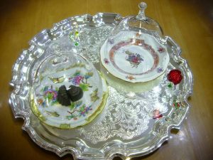 脚付のケーキスタンドに小皿をのせたり直接フタをしたりと用途がたくさん。