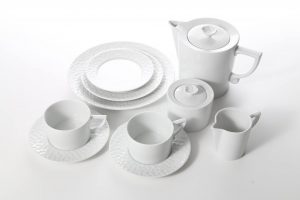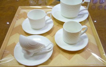 「ロイヤルブロッサム」は、1739年に白いガマズミの花をモチーフに作られた立体的な「スノーボール装飾」を、テーブルウェアの平面レリーフに移した新しいシリーズ。「スノーボール装飾」は、マイセン磁器の創始者、アウグスト強王の息子、アウグスト3世が最愛の王妃、マリア・ヨゼファへ「枯れない花を贈りたい」という強い願いから誕生したそうです。