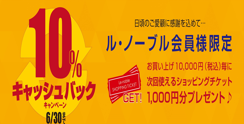 お買上げ10,000円(税込)ごとに、7月末まで使えるル・ノーブルの1,000円分のショッピングチケットをお渡し致します!