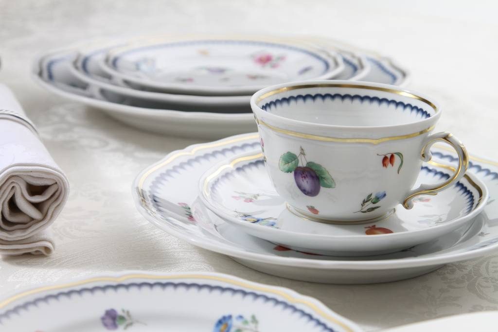 リチャードジノリならではの白地に、青紫のプラムを中心にフルーツや小花を絶妙なバランスで散らしたイタリアン・フルーツ。