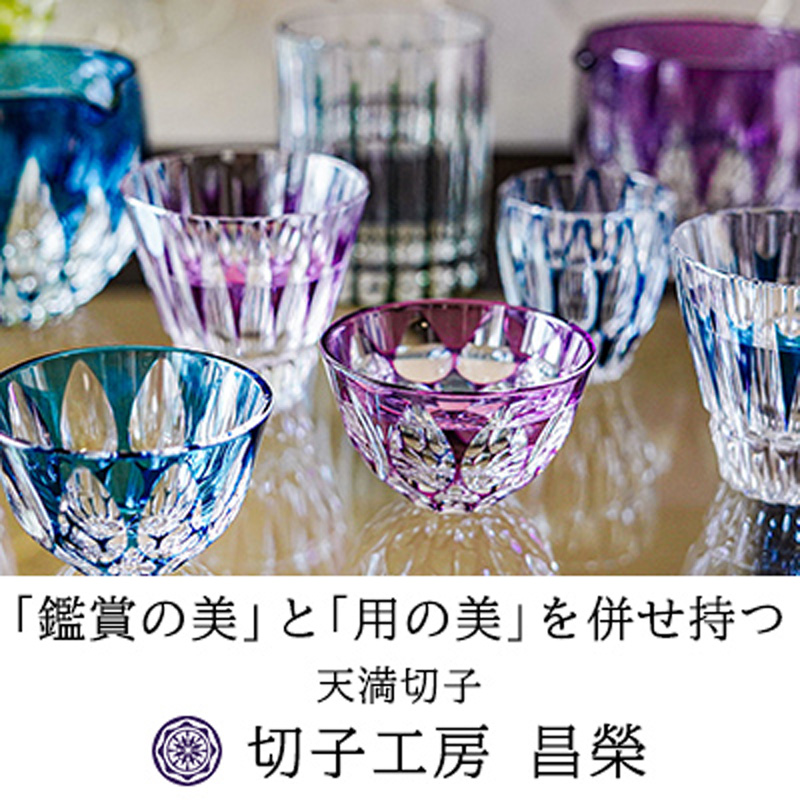 天満切子は、大阪のガラス文化を支える存在として、師匠の宇良武氏一が従来の切子に独特の輝きを与えたもの。その宇良武一氏の下、学んだ技術を生かして、更なる技術と輝きを追求したいと始めたられたのが切子工房 昌榮の天満切子です。昌榮の天満切子は、 大阪ガラス(大阪天満が発祥の地)の切子の技術を受け継ぐとともに、時代に沿った新鮮なデザインを取り入れた器です。