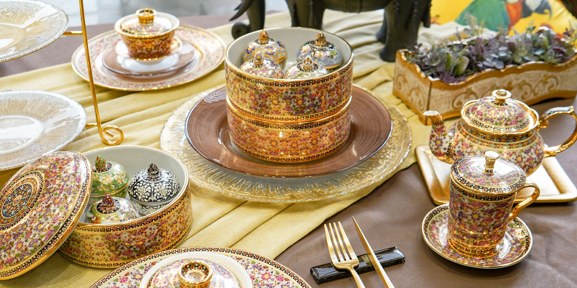 金彩、プラチナ彩、華やかな多色の色絵付け等、ベンジャロン焼の伝統的な魅力や製造技術を踏襲する製品だけでなく、現代の生活スタイルにあったオリジナルデザインの創作も手がけており、その製品はタイのセレブリティや高級ホテルにも数多く納められ、ベンジャロン焼の一流メーカーとしてその地位を確立しています。