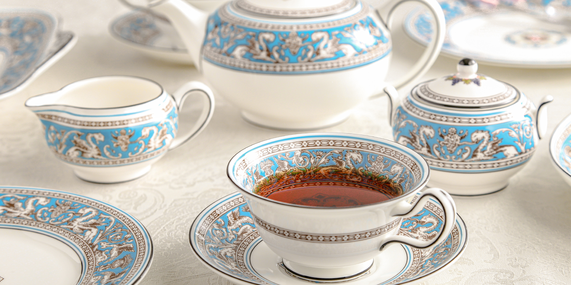 1874年に発表された、ルネッサンスの意匠が美しいロングセラーシリーズです。鮮やかなターコイズブルーの地色に、ドラゴンやフェニックスなど伝説上の生き物をあしらったエキゾチックなボーダー柄はとても印象的です。