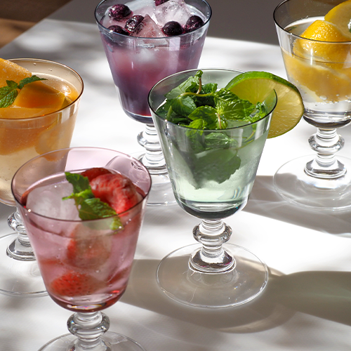 きらりと輝く5色のグラス。ヴェトロフェリーチェの多様なプレートともマッチする色展開と光沢が特徴です。またステムが短いので、日常使いにも便利です。