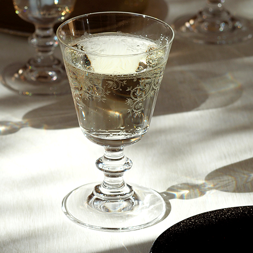 ステラと同じシェイプのグラスに、クラシカルな蔓模様の装飾が施されています。光の加減で表情を変えるこのグラスは、大人のくつろぎのひとときに使っていただきたい一品です。