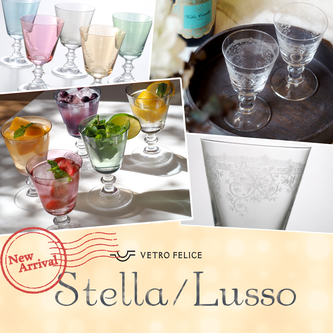 きらりと輝く5色のグラス。ヴェトロフェリーチェの多様なプレートともマッチする色展開と光沢が特徴です。またステムが短いので、日常使いにも便利です。イタリア語で「星」を意味するステラ、食卓に輝きをもたらします。