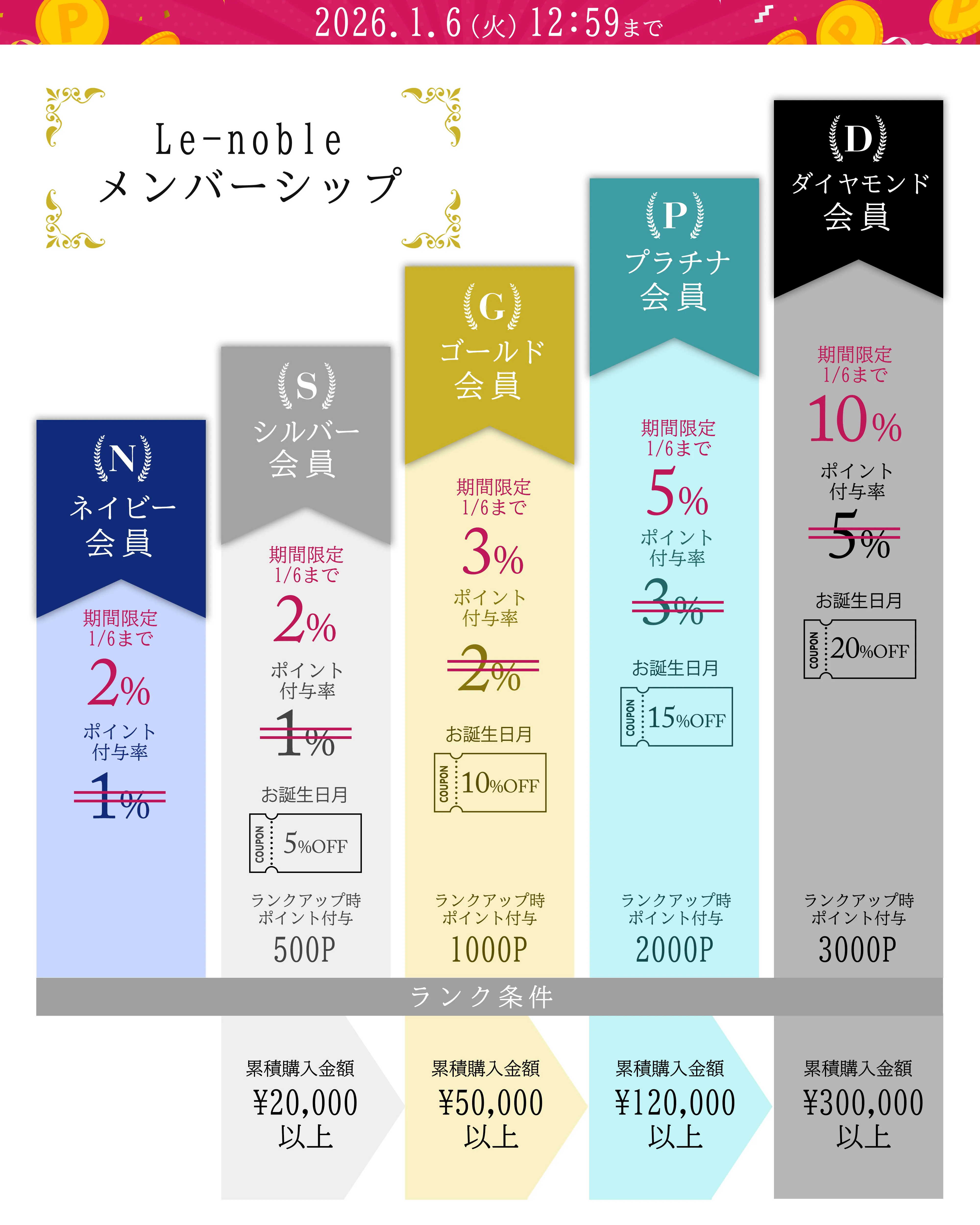 期間中のお買い上げ(オンラインショップ限定)について、「Le-noble メンバーシップ」に基づく会員ランクポイントの付与率がアップいたします。